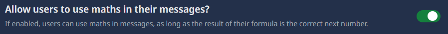 If this option is enabled and users have some “Albert Einstein” brains, they can use basic mathematical expressions to represent the counting number. For example, instead of sending “10”, a user could send “5+5”. The bot will evaluate the expression and count it as the correct number. If this option is disabled, users must send the exact number without any mathematical expressions. This setting is recommended to add some extra fun and variety to the counting game.