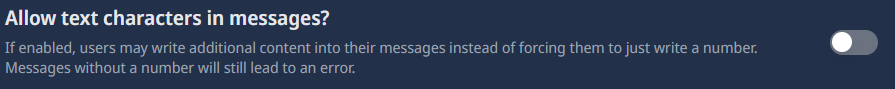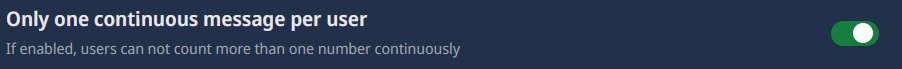 If this option is enabled, users can include comments or text along with their counting messages. For example, a user could send "5 Let's keep going!" as their counting message. If this option is disabled, users must send only the number without any additional text. This setting is recommended to maintain clarity in the counting game.