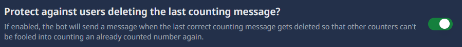 If this option is enabled, the bot will protect the last counting message from being deleted. This means that if a user tries to delete the last counting message, the bot will send a message saying that the last counting message got deleted and will repost the last correct number. This setting is recommended to prevent users from ruining the counting game by deleting messages.