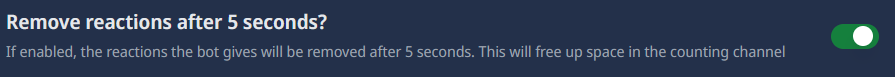 If this option is enabled, the bot will remove its reaction from the counting message after 5 seconds. This setting is recommended to keep the counting channel clean and prevent it from being cluttered with reactions.