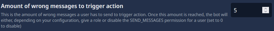 Here, you can specify the number of wrong messages that will trigger an action from the bot toward a user who reaches that amount (the “x” stands for the number you set here). If you want, the bot can assign a role to the user that has limited permissions, or it can remove the user’s SEND_MESSAGES permission for the selected channel(s). If you don’t want to use this feature, simply enter 0.