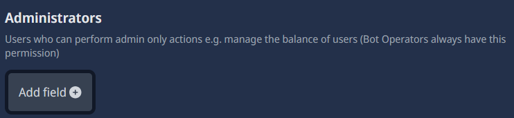 Here, you can add administrators who have access to all economy commands and features, regardless of their role or permissions on the server. You can add multiple administrators by clicking the "Add Field" button. Just provide the user ID of the user you want to add. Bot opperators will always have this permission by default.