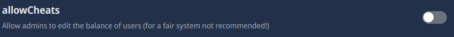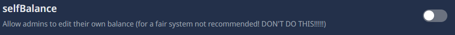 This option allows administrators to edit their own balance this is kinda similar to the "allowCheats" option, but only for their own balance. Please do not enable this option, as it is considered cheating and unfair to other users, it’s best to stay away from it.