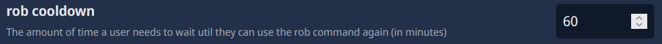 This option allows you to set the cooldown time for the rob command. This means that users will have to wait this amount of time (in minutes) before they can rob again. You can set this to any amount you like.