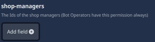 Here, you can add shop managers who have access to manage the economy shop, including adding, removing, and editing items. You can add multiple shop managers by clicking the "Add Field" button. Just provide the user ID of the user you want to add. Bot opperators will always have this permission by default.