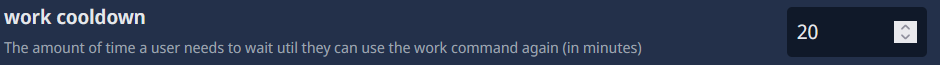 This option allows you to set the cooldown time for the work command. This means that users will have to wait this amount of time(in minutes) before they can work again. You can set this to any amount you like.